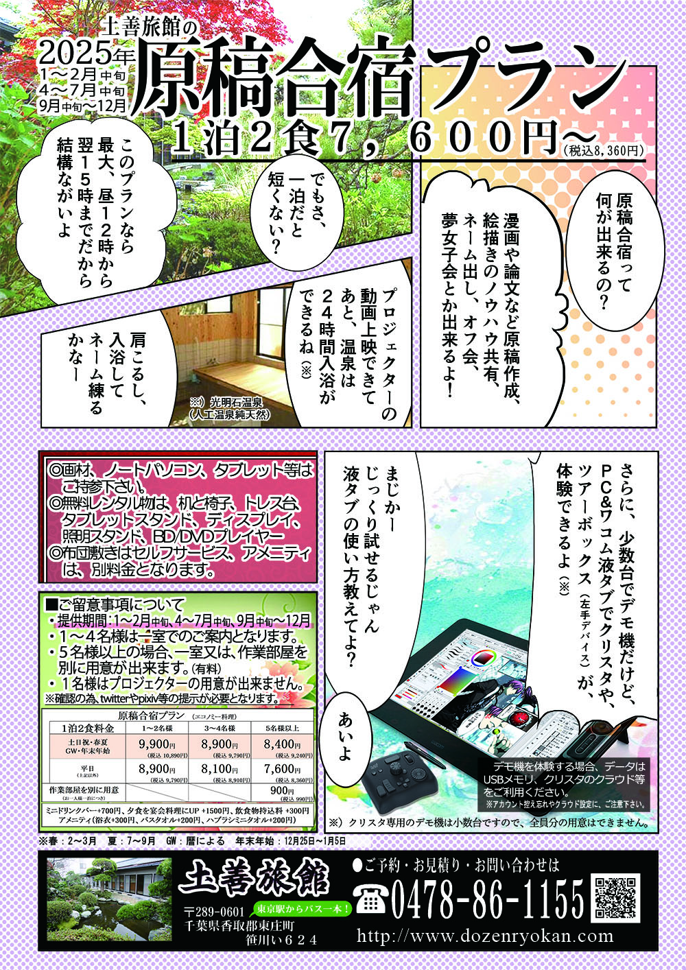 土善旅館の原稿合宿は、漫画や論文など原稿作成、絵描きのノウハウ共有、ネーム出し、オフ会、夢女子会などの御利用に、ご好評いただいております。当館での原稿合宿プランはいかがでしょうか。
