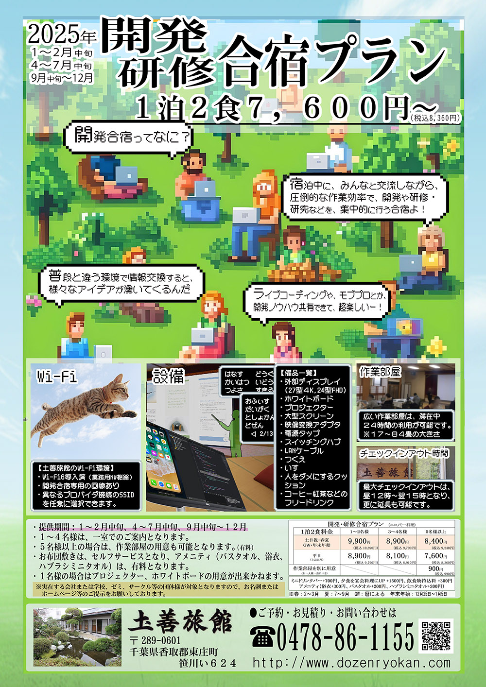 土善旅館の開発合宿は、プログラマー、デザイナー、クリエイターなど会社、大学、ゼミ、サークル様を中心に、開発、研修の御利用に、ご好評いただいております。ハッカソンイベント、ワーケーション、もくもく会、カルチャー、研修合宿、創作合宿などに、当館での開発合宿プランはいかがでしょうか。